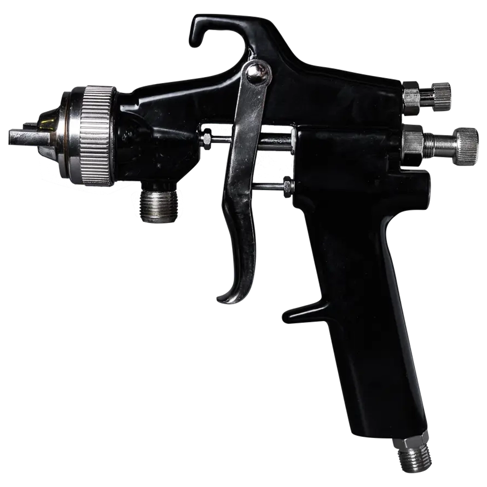 Краскораспылитель включается в работу нажатием на курок. При нажатии на курок 10 перемещается воздушный клапан 9 и открывается воздушный канал в корпусе, по которому сжатый воздух подается в головку. Одновременно перемещается игла 4 и открывает отверстие сопла 3 для выхода шпаклевки из распылителя. На выходе из сопла шпаклевка подхватывается, дробится на мельчайшие частицы сжатым воздухом и напыляется на обрабатываемую поверхность. Конструкция головки предусматривает изменение кольцевого зазора между головкой и соплом, что позволяет подбирать оптимальный режим распыления. Ход иглы определяет количество выходящей из сопла шпаклевки или краски. С увеличением хода расход шпаклевки увеличивается и наоборот. Необходимый ход иглы устанавливают с помощью регулятора.